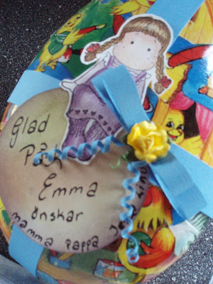 Vi är sommarstugan och jag tänkte skänka min make och dotter varsitt ägg så kom jag ju på att jag inte har altrat ägg till dem - och inte heller hade jag med mig hela pysselverkstan med mig upp heller... Så ett alterntiv till att altra hela ägget var att pynta ett vanligt "grällt" påskägg med lite papper, distressmålade figurer och rosor........